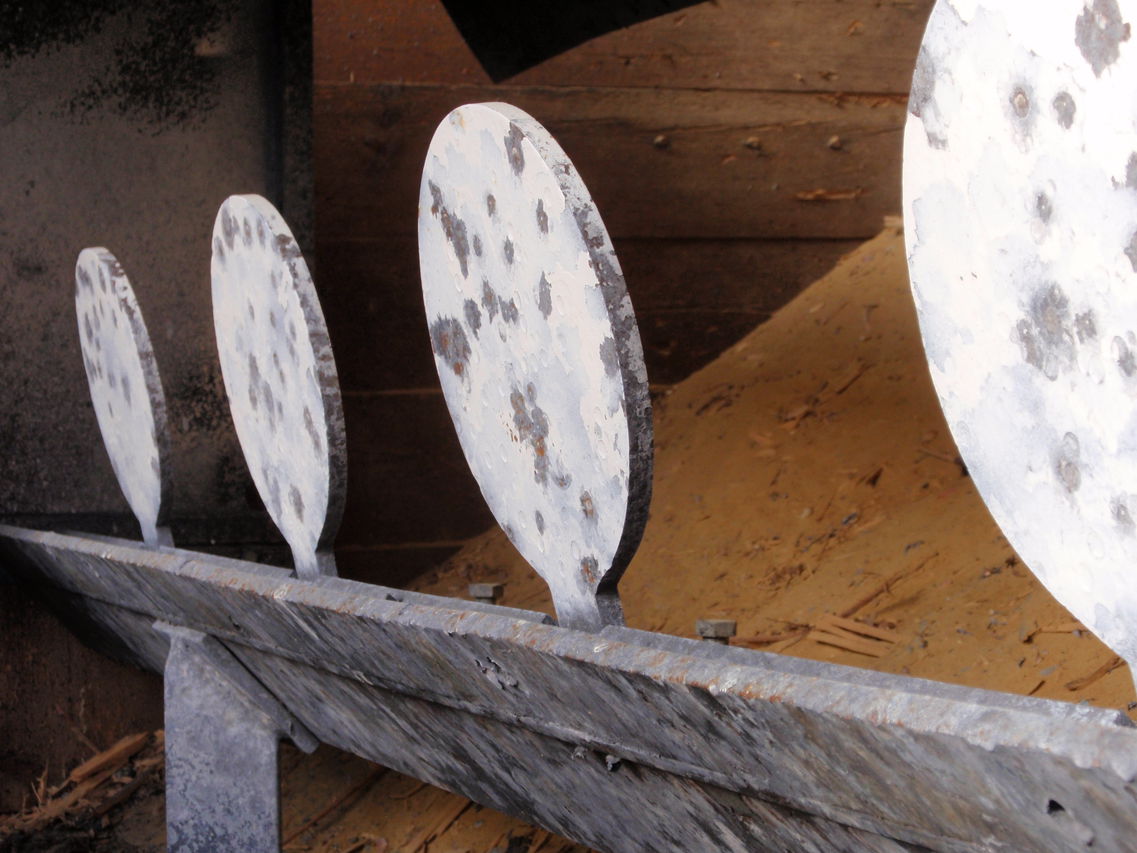 25 Meter Fallscheibe, hier geht es um Präzision und das in kürzester Zeit. Es wird auch eine Reihe von fünf Stahlplatten geschossen, die durch das Abkippen einen Treffer signalisieren. |
