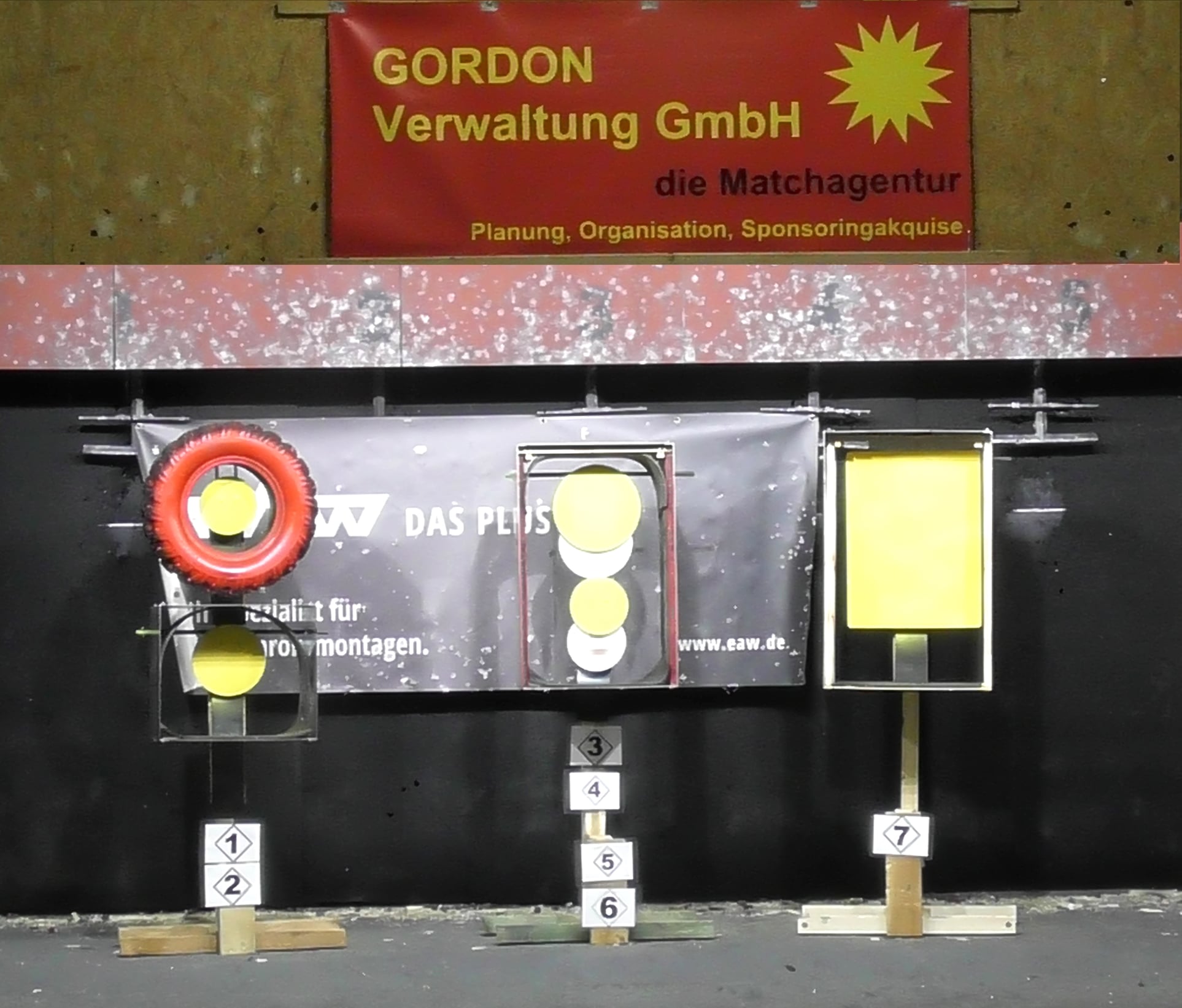 25 Meter Speed-Schießen, dass auf fünf nebeneinander hängenden speziellen Papierscheiben geschossen werden muss. Ein Schuss pro Scheibe, Schnell und präzise.